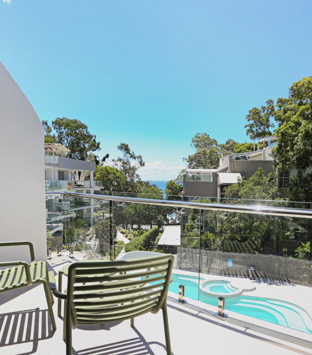 The Cove Noosa Resort offers a range of luxury apartments including one, two, and three-bedroom options, many with ocean views and spacious balconies.