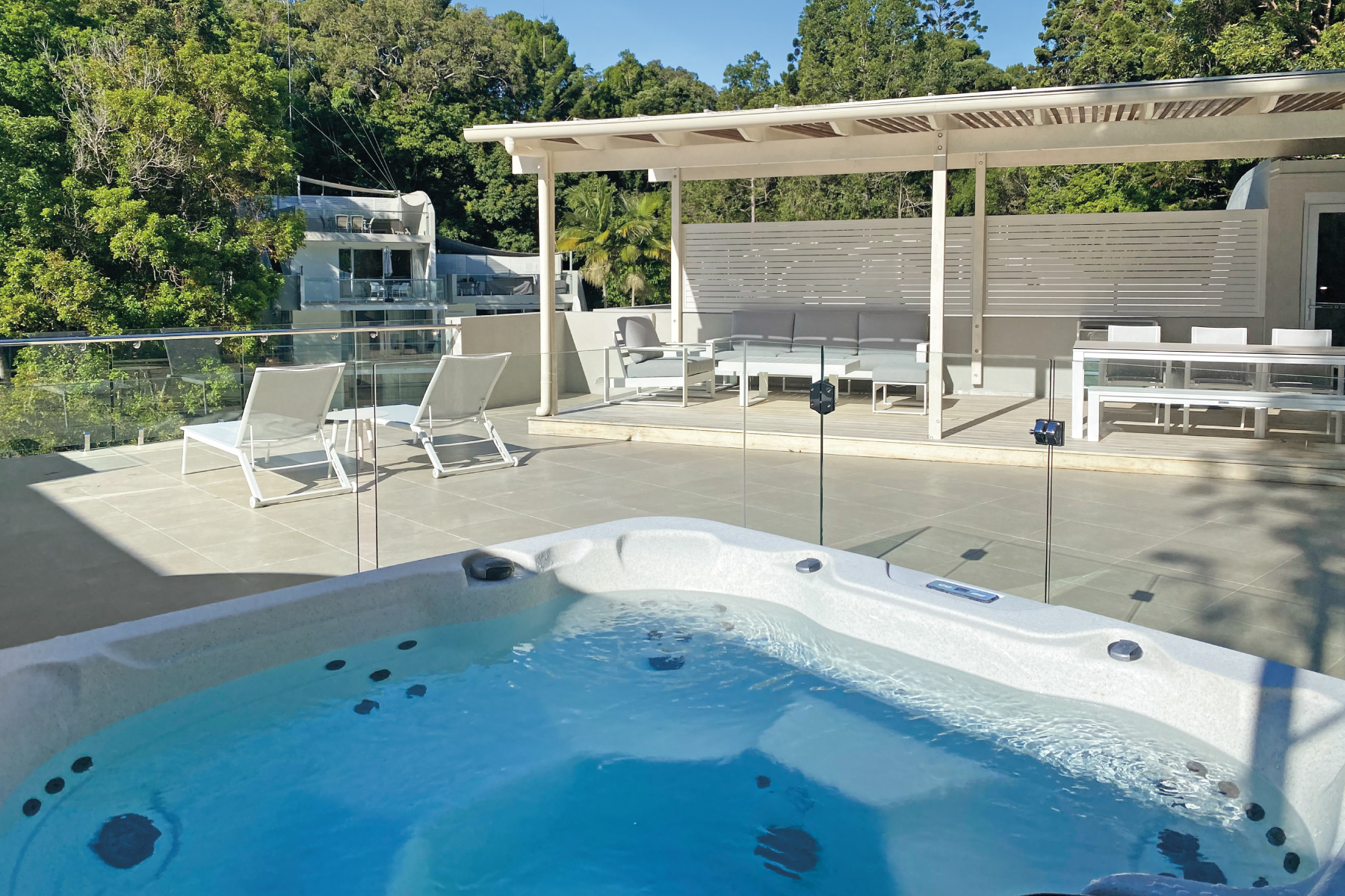 - Outdoor dining table, BBQ and sun lounges on the rooftop terrace with heated spa